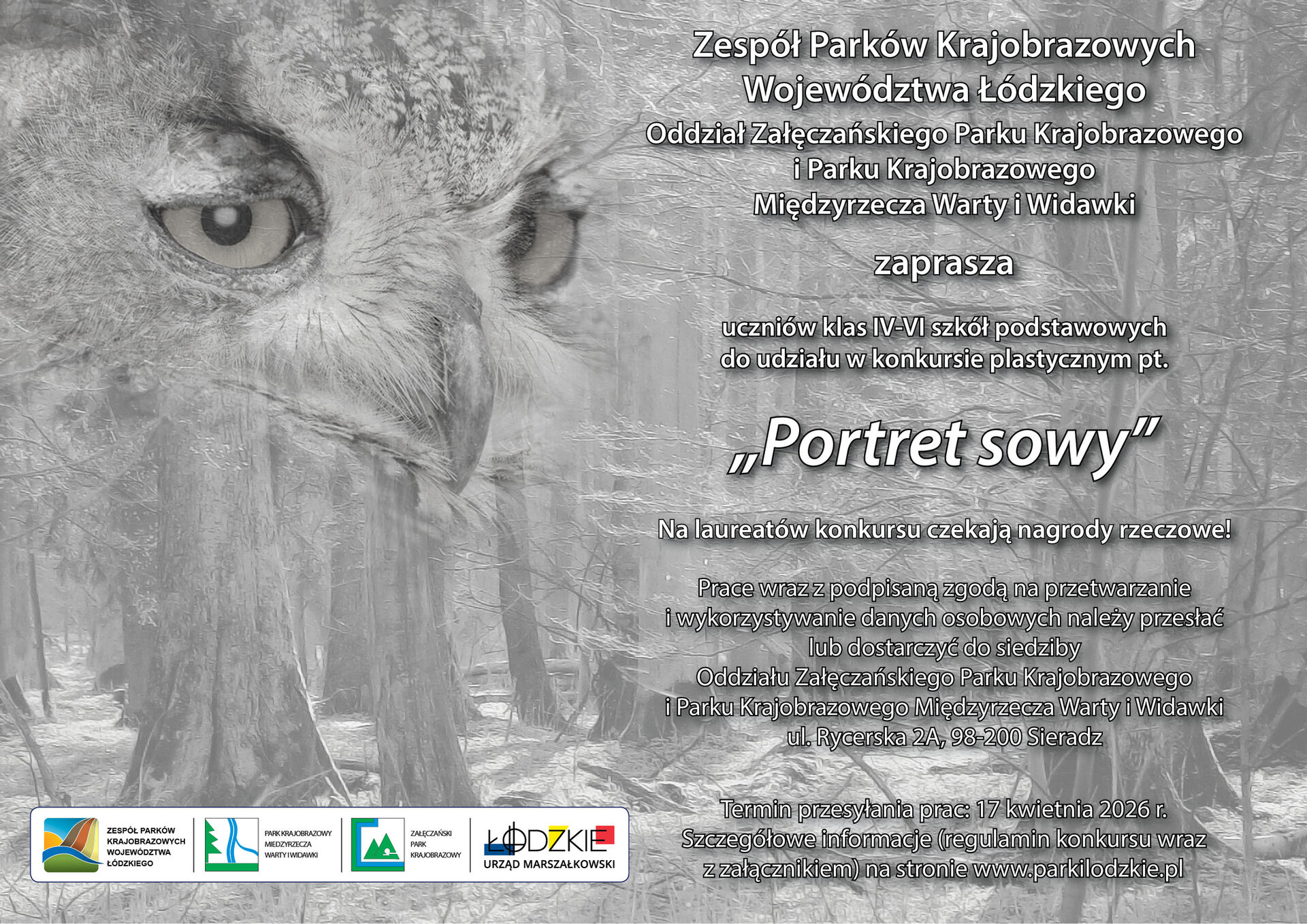 Zespół Parków Krajobrazowych Województwa Łódzkiego Oddział Załęczańskiego Parku Krajobrazowego i Parku Krajobrazowego Międzyrzecza Warty i Widawki zaprasza uczniów klas IV-VI szkół podstawowych z gmin z terenu Parku Krajobrazowego Międzyrzecza Warty i Widawki oraz Załęczańskiego Parku Krajobrazowego do udziału w konkursie plastycznym pt. „Portret sowy”.