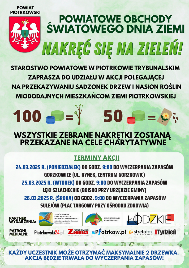 W ramach Światowego Dnia Ziemi od wielu lat Starostwo Powiatowe w Piotrkowie Trybunalskim organizuje akcję "Nakręć się na zieleń" - ZPKWŁ Oddział Nadpilicznych Parków Krajobrazowych jest partnerem tego wydarzenia. Akcja cieszy się wielką popularnością wśród mieszkańców regionu - wielu mieszkańców przyniosło plastikowe nakrętki, żeby wymienić je na sadzonki drzew, krzewów lub nasion. Pracownicy ONPK przekazując materiał zadrzewieniowy udzielali zainteresowanym porad hodowlanych, informacji o gatunkach i ich wymaganiach siedliskowych. Akcja odbyła się w Sulejowie, Gorzkowicach i Łękach Szlacheckich na terenie Sulejowskiego Parku Krajobrazowego i jego otuliny.