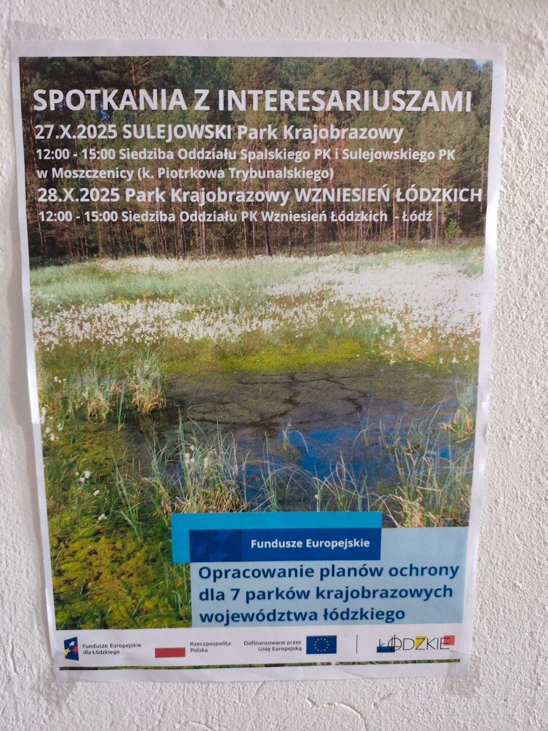 Dnia 27 października 2025 roku o godzinie 12.00 w siedzibie Oddziału Spalskiego Parku Krajobrazowego i Sulejowskiego Parku Krajobrazowego przy ulicy Piotrkowskiej 106 w Moszczenicy odbyło się spotkanie z interesariuszami, którego celem było przedstawienie drugiego etapu prac przygotowawczych do opracowania projektu planu ochrony Sulejowskiego Parku Krajobrazowego.
