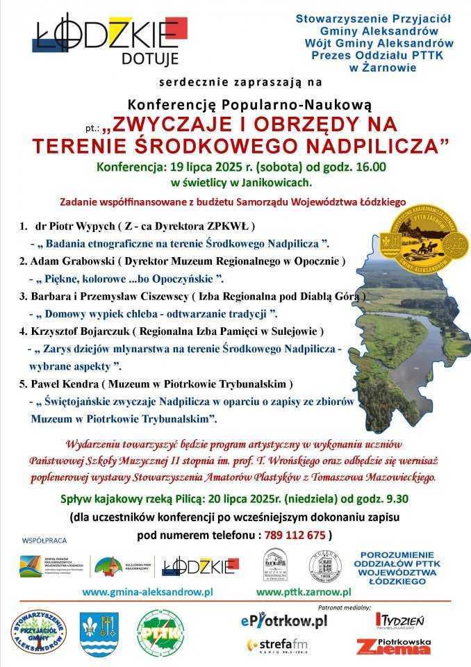 W imieniu organizatorów serdecznie zapraszamy na konferencję popularno-naukową pt. "Zwyczaje i obrzędy na terenie środkowego Nadpilicza". Konferencja odbędzie się 19 lipca 2025 r. /sobota/ o godz. 16.00 w świetlicy gminnej w Janikowicach, Gmina Aleksandrów, Powiat Piotrkowski. Wstęp wolny.